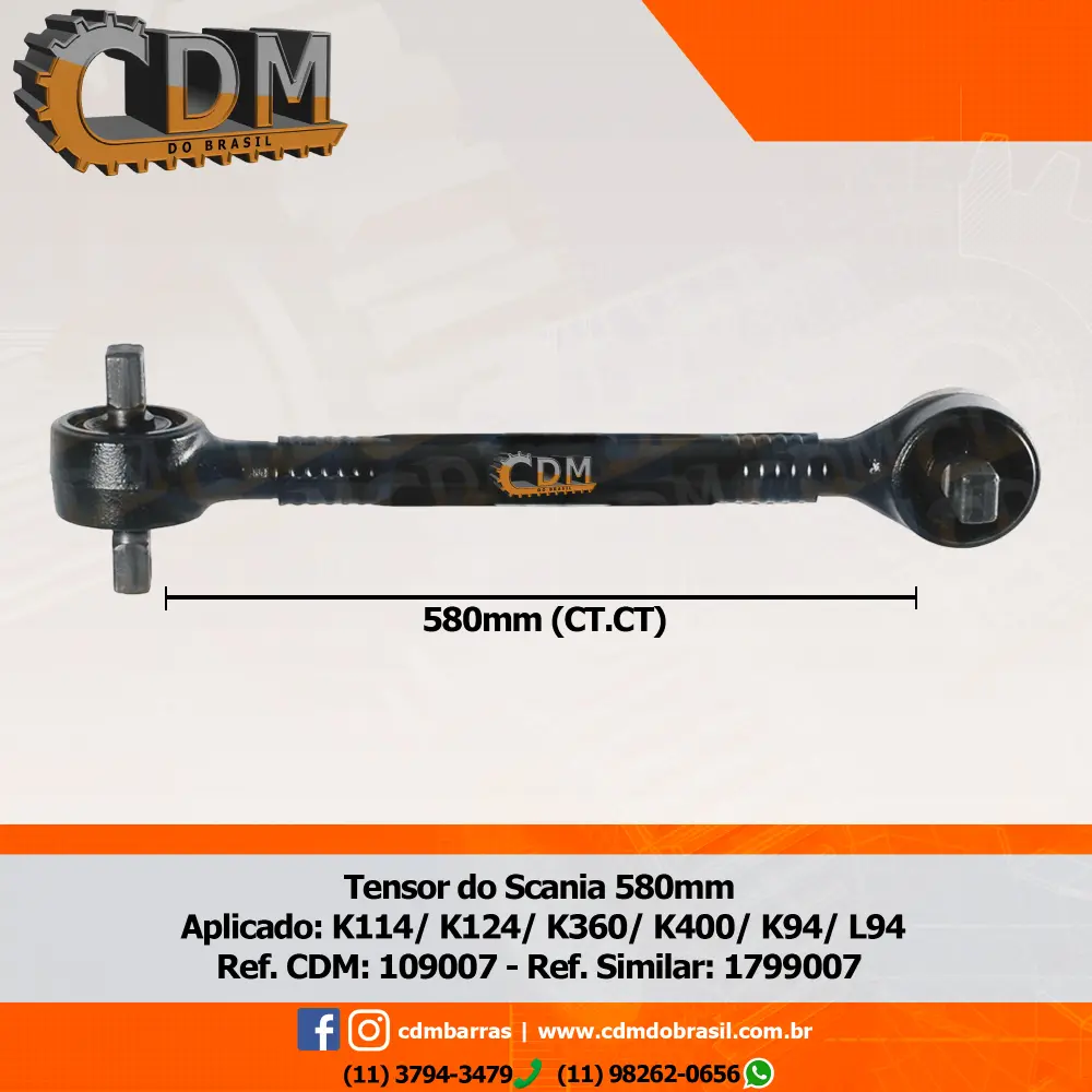 Série Similar: 1799007 / 60700812 / 700812 Barra de Reação (Tensor/ Barra Tensora) – Aplicação Scania K114/ K124/ K360/ K400/ K94/ L94 (109007) comprimento: 580mm peso: 10 kg diâmetro do tubo: 50mm Item de reposição: 106521 Referência: 109007