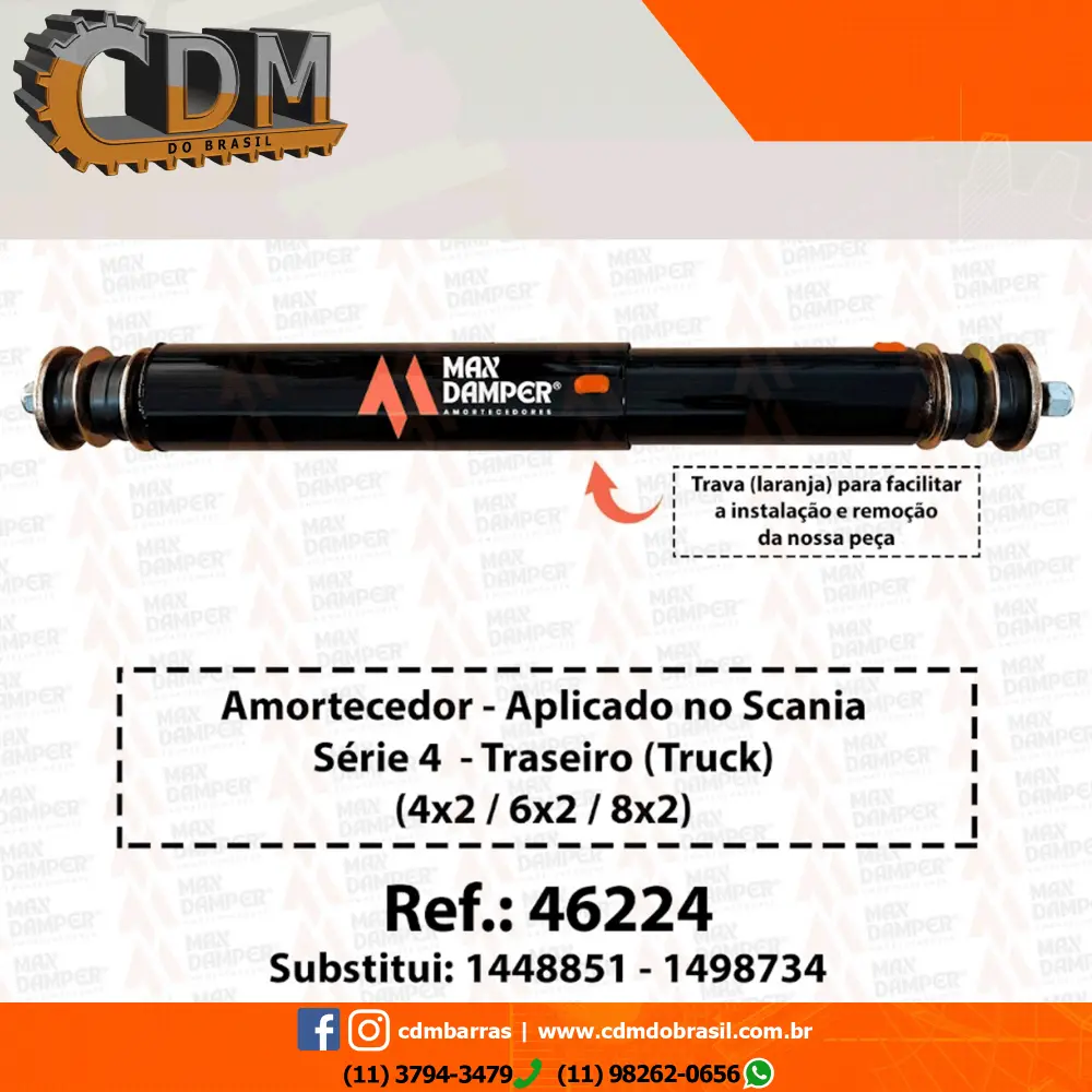 Ref. Similar: 1448851/ 1498734 – Amortecedor Aplicado no Scania Série 4 – Traseiro (Truck) – (4X2 / 6X2 / 8X2) 46224 Referência: 46224